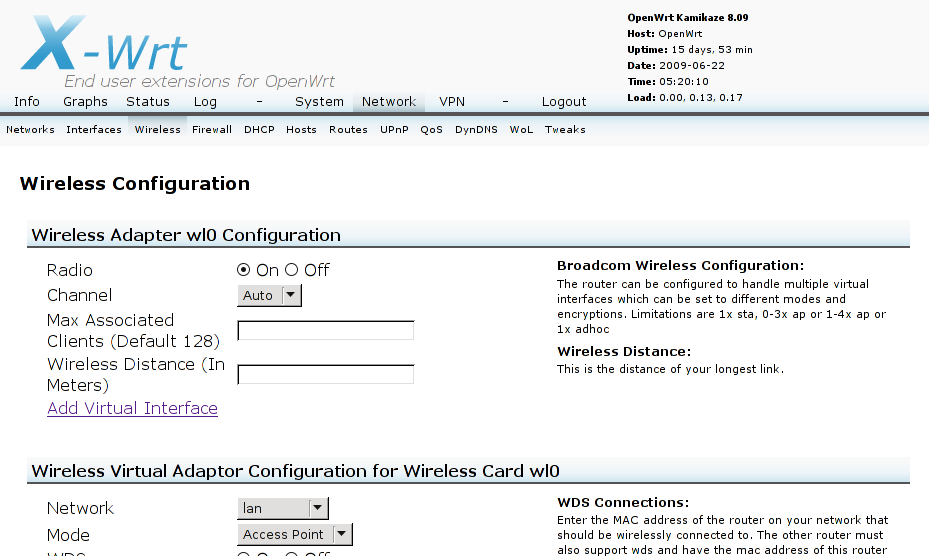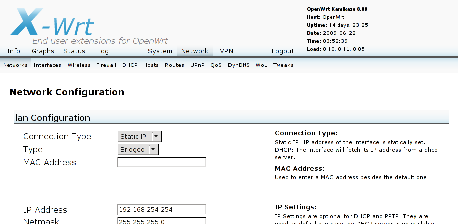 To add a open wireless network in X-Wrt, you need to go to the Network tab, and then on each sub-tab: