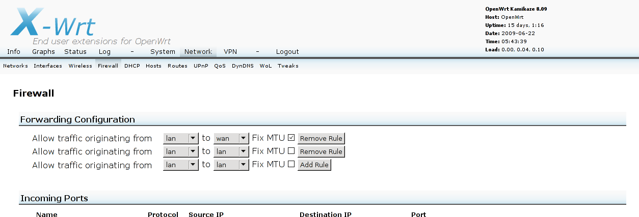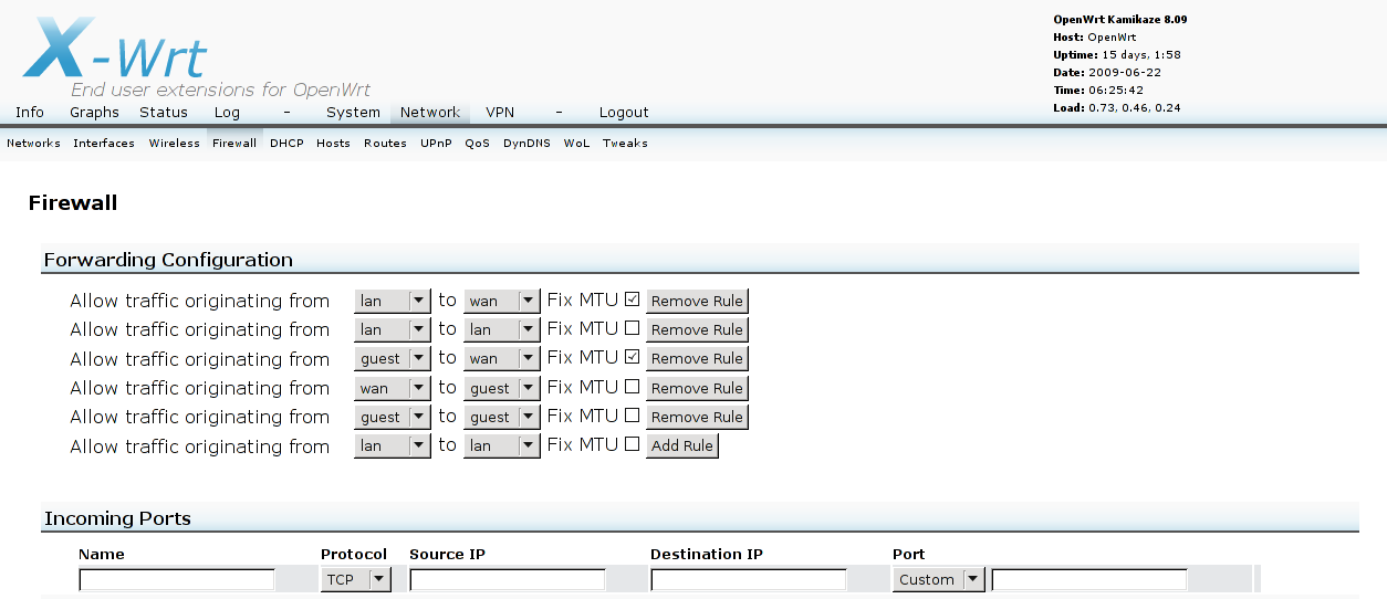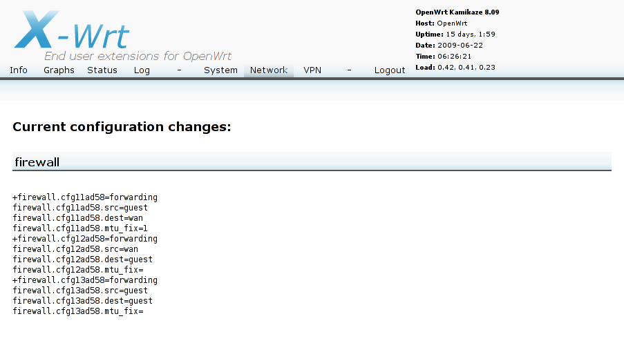 If you don’t manually edit /etc/config/firewall first, you get some errors, such as “iptables: No chain/target/match by that name” and “iptables v1.3.8: Couldn’t load target ‘zone_guest_ACCEPT’ :File not found”: