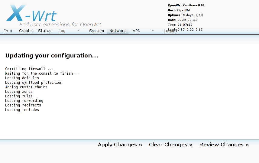 When I applied these changes, it froze on ‘Updating your configuration’ again. Either cycle power, or log in and kill the “/usr/bin/webif-page config.sh” process as shown before. How sad.