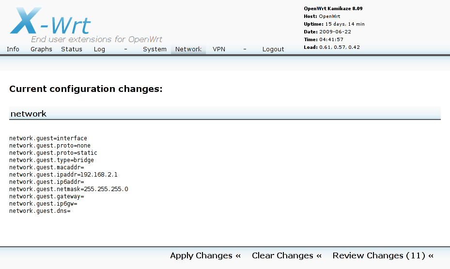 At this point, you have a ‘guest’ network setup, but it doesn’t do anything at all. If you want to peek behind the scenes, SSH to the router and look at /etc/config/network. There is a ‘guest’ interface, but it has no ‘ifname’ option. That’s the next step.