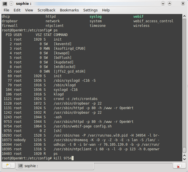 The culprit is process 9754, the command “/usr/bin/webif-page config.sh” (your process number will be different). Something is stuck, and I don’t know what. The fix is to run ‘kill 9754’, which will stop that process and allow the configuration to proceed. In a few seconds, the Networks sub-tab will reload, and the changes are committed.